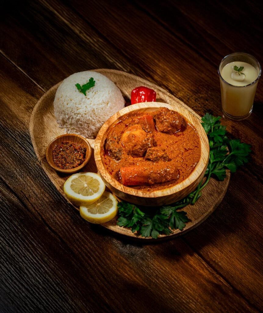 16,90 €Riz blanc, sauce à base de gombos, crevettes, viande de Boeuf mijotée, huile de palme, oignons, tomates, ail, épices.